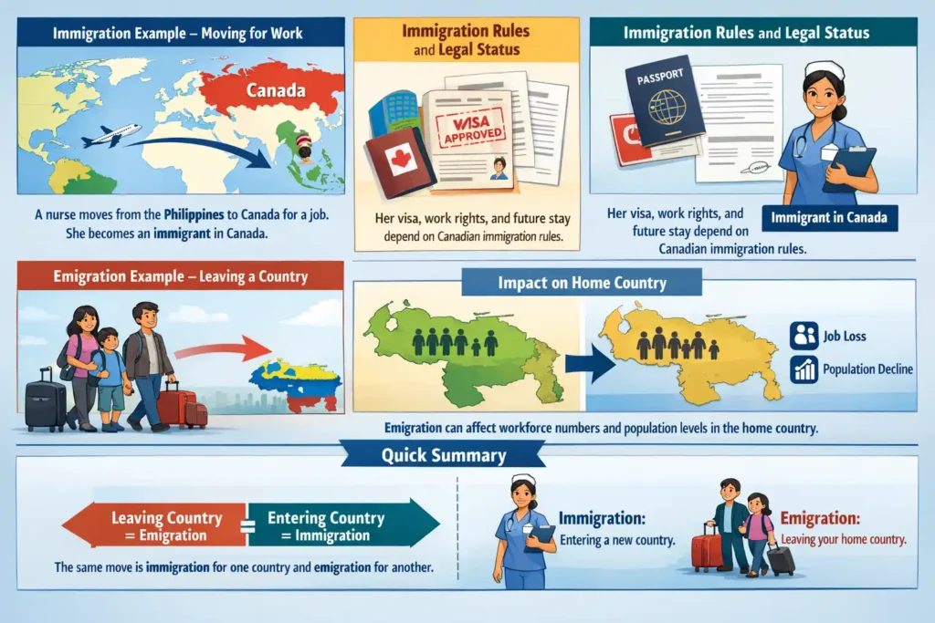 Immigration example: A nurse moves to Canada for work and becomes an immigrant.