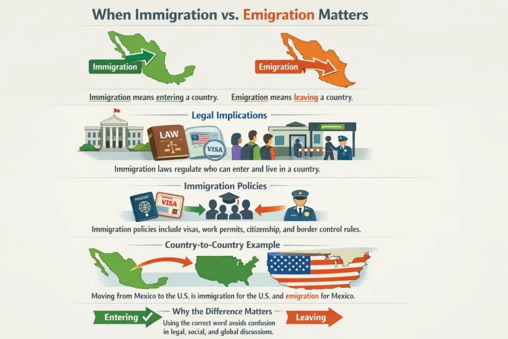 Immigration and emigration mean different things depending on who is talking and what they are focusing on. Immigration is about people moving into a country. It’s frequently linked with new prospects or jobs, schools and growth. Emigration is the movement of people out of a country. It often displays what a country is losing or the problems people face. Using to the correct word makes your meaning clear and shows respect particularly in schoolwork, news or legal writing.